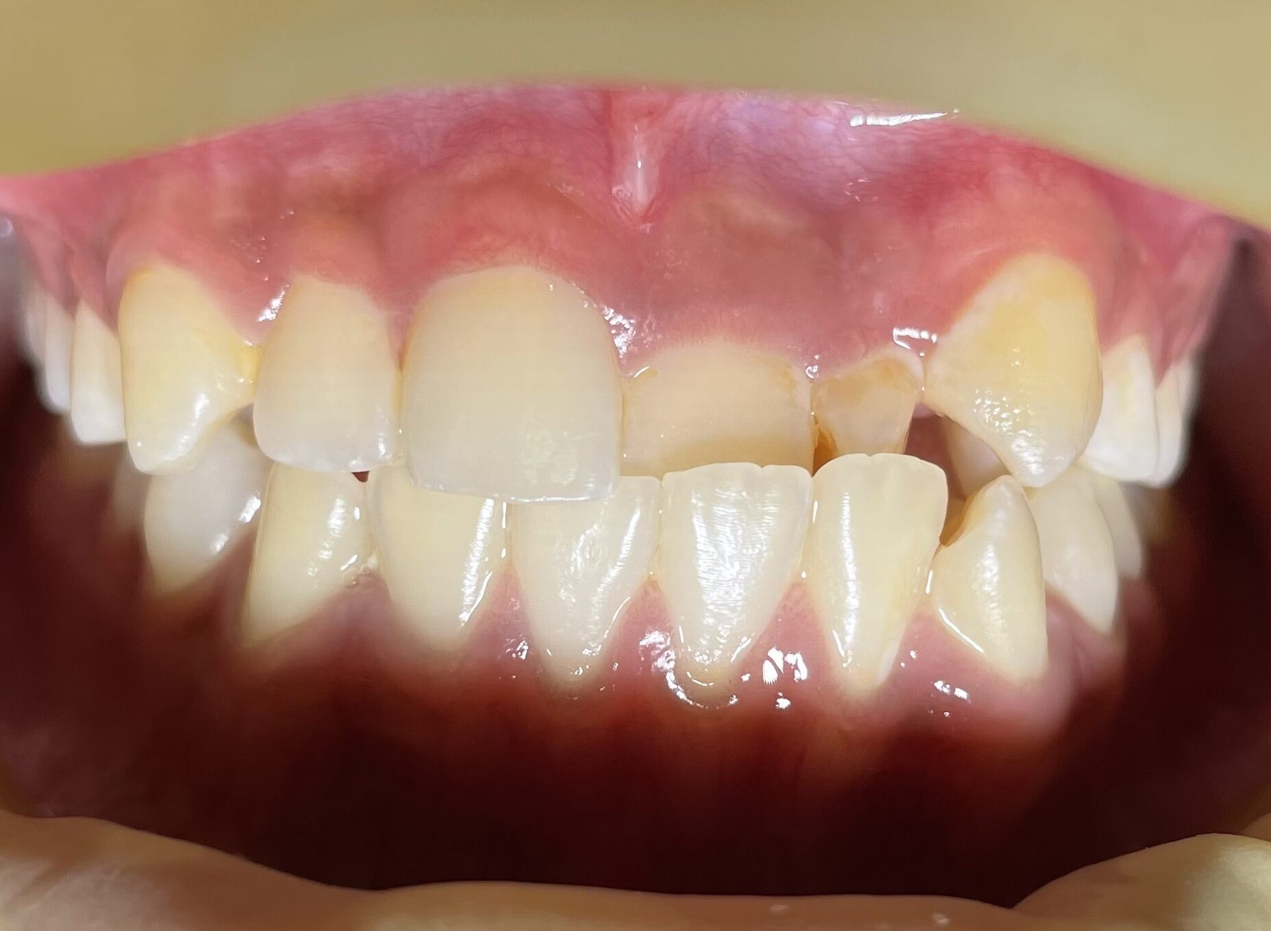 ฟันหน้าด้านล่างคร่อมกับฟันหน้าด้านบนบางส่วน ฟันตัดซี่ข้างบิดหมุน เนื่องจากฟันหน้ากัดคร่อมกันทำให้ปลายฟันหน้าด้านบนเริ่มสึก